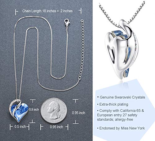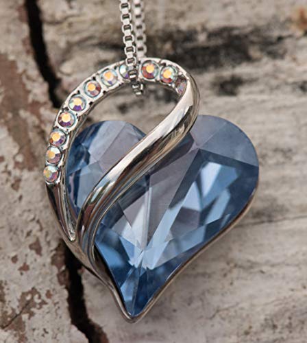 SPECIFICATIONS – Pendant Size: 0.5″ x 0.9″ |Chain Length: 18″+ 2″ |Plating: White Gold Plated Silver-tone | Clasp: Lobster Claw | Stone: Swarovski Crystal Wild Heart Shaped Stone, Light Sapphire Blue March December Birthstone; Swarovski Flatback Zirconia Rhinestones, Crystal AB Color.