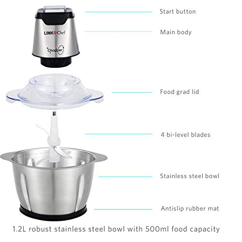 Mini Food Chopper LINKChef Food Processor Onion Vegetable Garlic Chopper Electric 4 bi-level blades 1.2L Robust Stainless Steel Bowl with 500ml Food Capacity Silver/ Black(FC-5125)- 3 Year Warranty (Silver and black)