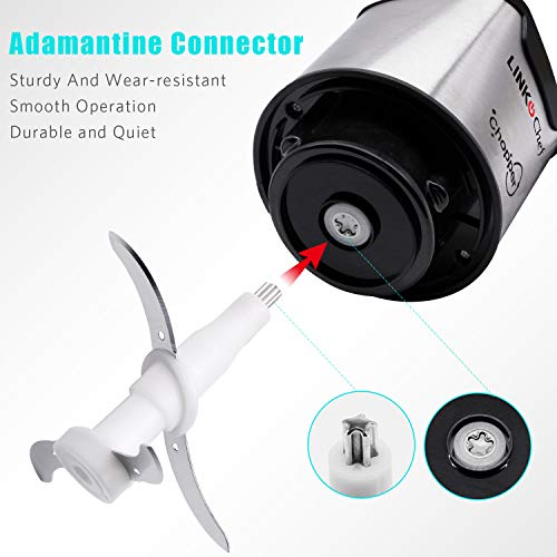 The LINKChef mini chopper takes advantage of 4 bi-level blades technology that chops vegetables evenly, minces garlic/herbs quickly, and purees sauces and dressings.