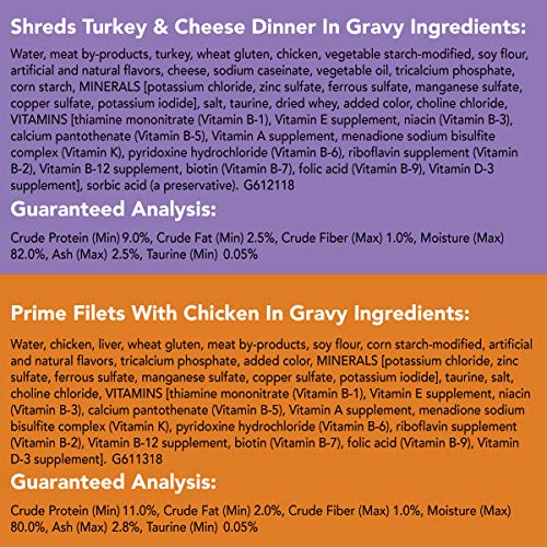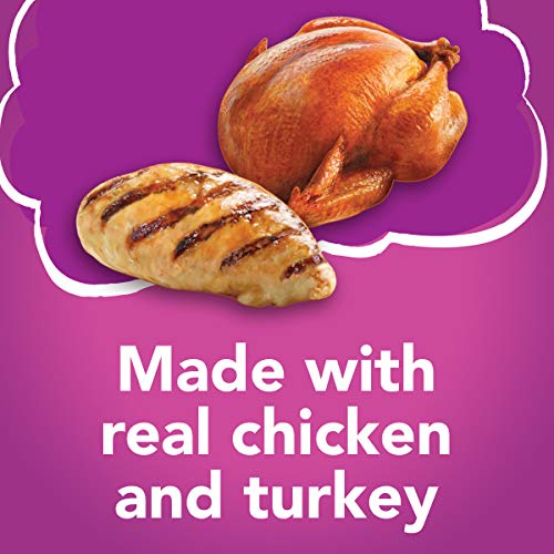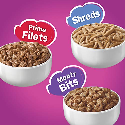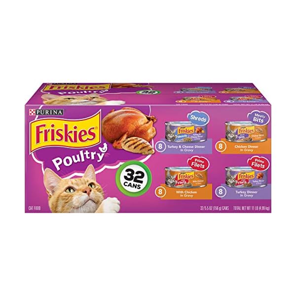 Keep your kitten or adult cat’s palate happy with the variety of delicious flavors in this Purina Friskies Poultry wet cat food variety pack. Each of this variety pack’s 32 meals is crafted to deliver nutrition that is 100% complete and balanced for the growth of kittens and maintenance of adult cats. Alternate between different recipes of rich, savory chicken and turkey to give her the high-quality protein she needs to help promote strong muscles and an active lifestyle. The different textures of poultry, from prime filets to savory shreds and meaty bits, gives her a range of consistencies that she loves and that keeps her running back for more at each and every mealtime. With eight cans of each wet cat food flavor in this case, you have enough of each type for several dinners, or you can switch between flavors to keep each feeding varied and fun for her. Help satisfy your cat’s cravings with the delicious goodness found in every can of this Purina Friskies wet cat food variety pack.
