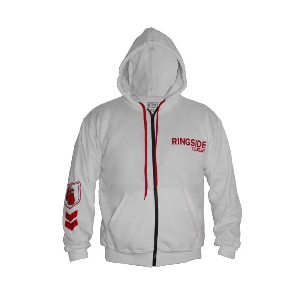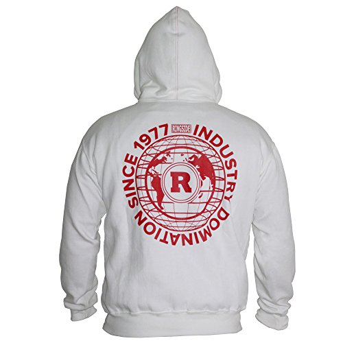 Relaxed-fit zip-up hoodie. Ringside Est. 1977 logo screen-printed on front left chest. Military inspired hanging gloves shield and stripes on right arm and Industry Dominations Screen-print logo on back. Comes with a complete gadget pocket in front. Thick cotton/polyester blended fleece.