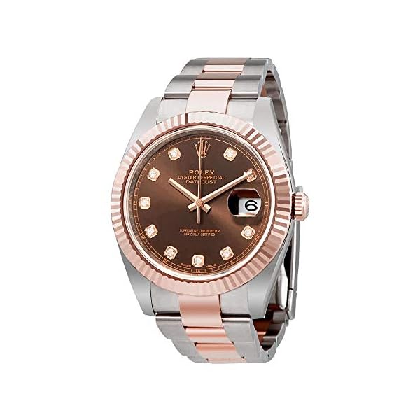 Stainless steel case with a stainless steel Rolex oyster bracelet with 18kt everose gold center links. Fixed fluted 18kt everose gold bezel. Chocolate dial with rose gold-tone hands and diamond / Roman numeral hour markers. Minute markers around the outer rim. Dial Type: Analog. Date display at the 3 o’clock position. Rolex calibre 3235 automatic movement with a 70-hour power reserve. Scratch resistant sapphire crystal. Screw down crown. Solid case back. Round case shape. Case size: 41 mm. Concealed crown clasp. Water resistant at 100 meters / 330 feet. Functions: date, hour, minute, second, chronometer. Luxury watch style. Watch label: Swiss Made. Item Variations: 126331-72611. Rolex Datejust 41 Chocolate Diamond Dial Steel and 18K Everose Gold Oyster Men’s Watch 126331CHDO.